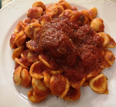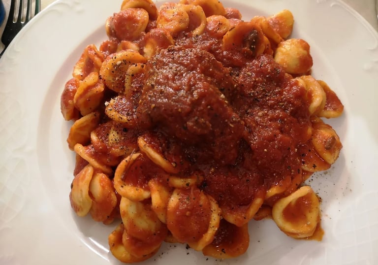 Die Braciola – gefüllte Fleischscheiben – werden in Tomatenragout gegart und mit Orecchiette serviert, was ein kräftiges Gericht ergibt, das oft zu festlichen Anlässen gereicht wird. Das vereint handwerkliche Pasta mit würziger Sauce und steht für apulische Hausmannskost.